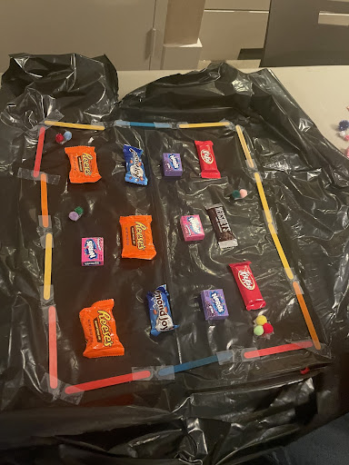Activity #2:  Next we made a DIY costume out of craft materials like glue, poster paper, and other craft materials to make the perfect costume. My team made a vending machine costume out of a garbage bags, halloween candy, and popsicle sticks. We also made buttons out of pom poms!